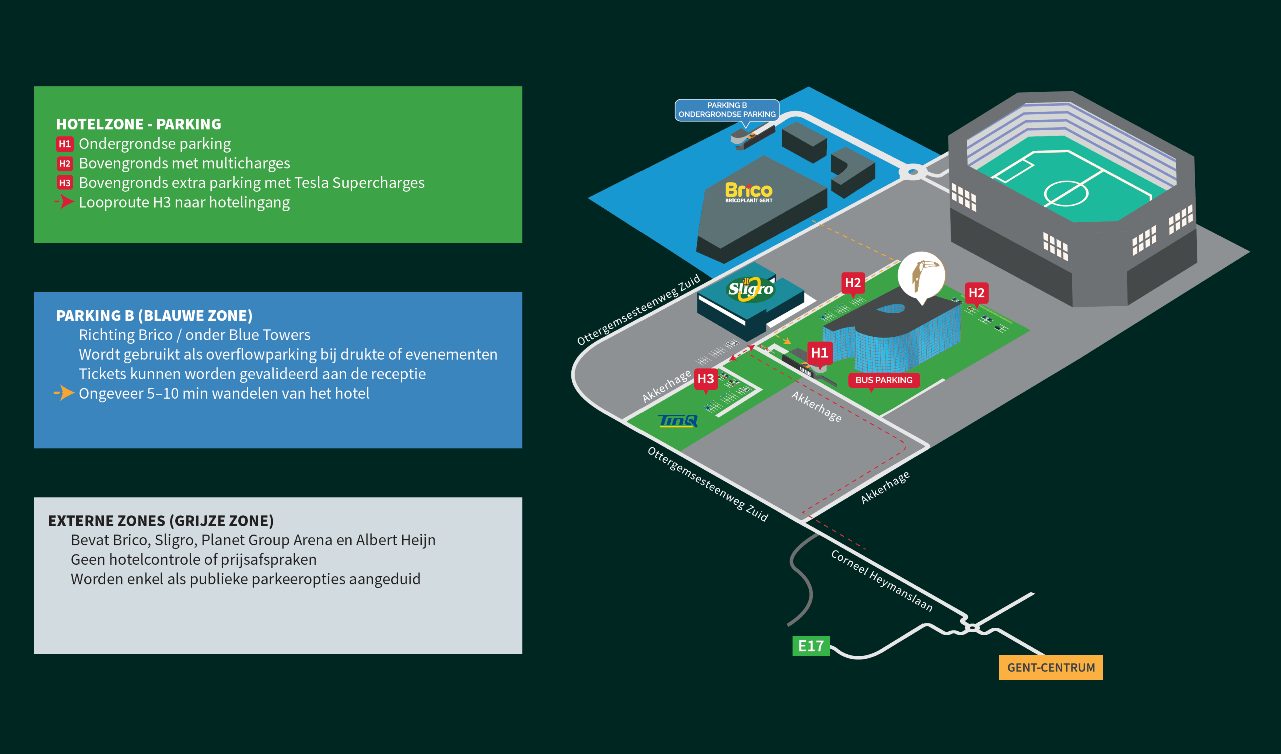 Wegens asfalteringswerken op hotelparking H3 vragen wij om te parkeren op Parking B (Blauwe Zone) – de ondergrondse parking van de Blue Towers (zie bijlage).